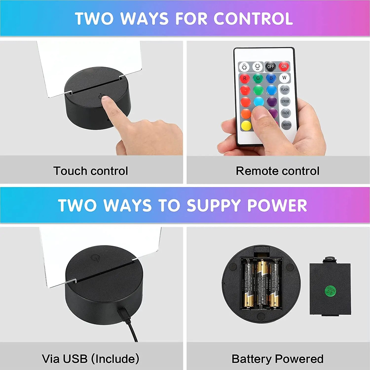 Power Supply: 3 × AA batteries (not included) or via USB cable (included)